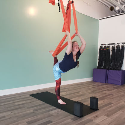 Amber using the aerial silk for support on the floor in a restorative bridge posture.